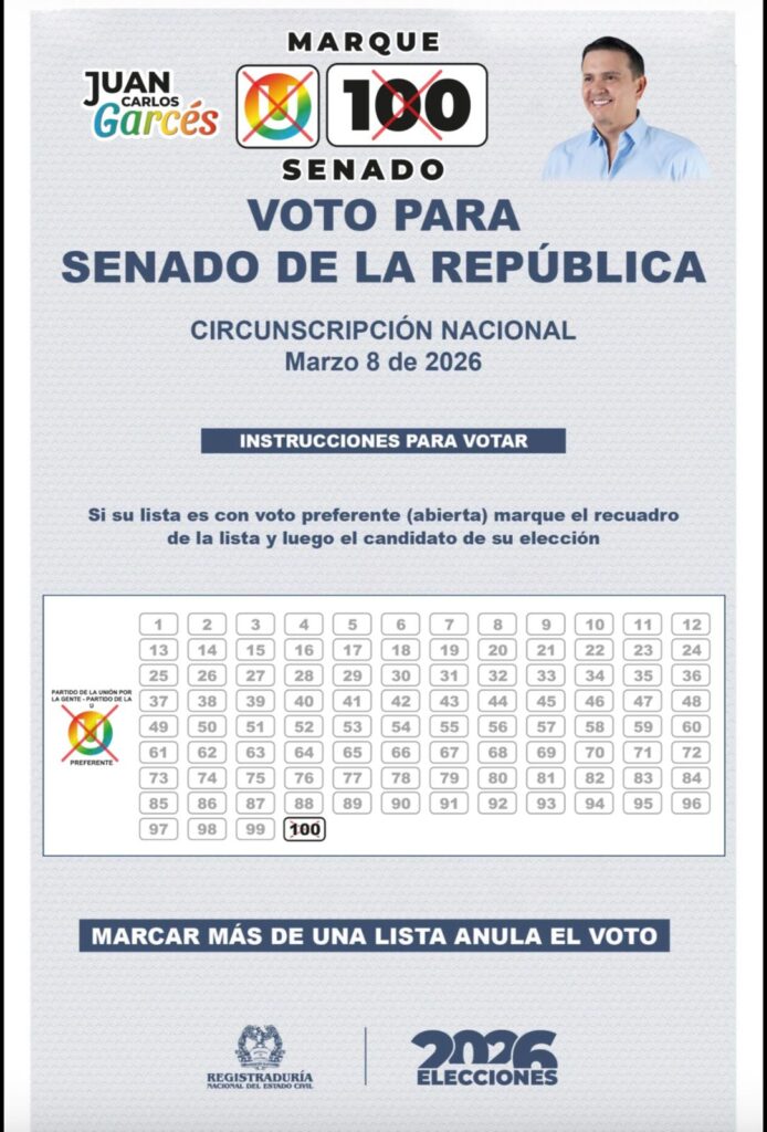 Con ese voto estarás apoyando a Juan Carlos Garcés al Senado de la República, una voz comprometida con el progreso, las regiones y las oportunidades para todos.